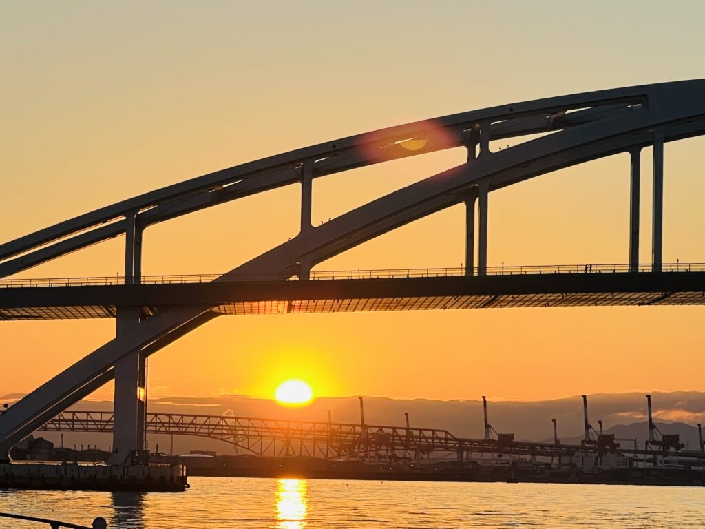太陽が昇る位置には「夢舞大橋(ゆめまいおおはし)」がかかっており、橋の鉄骨が少し重なりますが、それでも十分に美しく、満足度の高い初日の出を拝むことができました。もし橋の構造物を避けたい場合は、夢舞大橋の上から見ている人もいたので、来年はそちらからの見え方を調べてみるのもよさそうです。