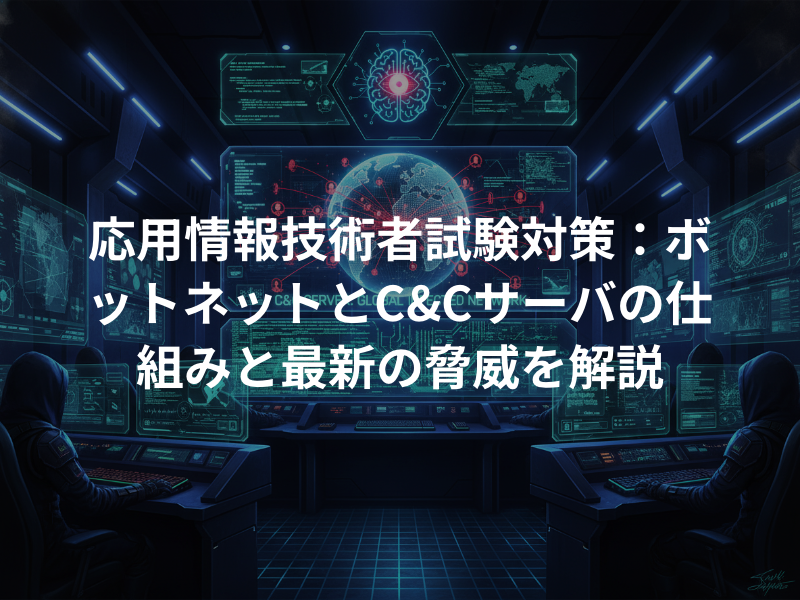 ボットネットは、マルウェア感染により攻撃者の手先となったPCやIoT機器の集合体。そして、それらを遠隔操作する司令塔がC&Cサーバだよ。最新トレンドでは、AIによる自律化や検知回避が進んでおり、防御側も機械学習を用いた高度な検知が求められているんだ。応用情報技術者試験では、この用語の定義だけでなく、「DDoS攻撃の踏み台にされる」「C&Cサーバとの通信を遮断することが重要」といった実戦的な対策もしっかり覚えておこうね!