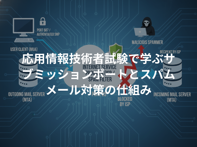さて、応用情報技術者レベルを目指すならもう少し踏み込もう。現在、サブミッションポートとSMTP AUTHは「やって当たり前」のインフラだ。今はさらに、送信ドメイン認証のSPF、DKIM、DMARCの3セットが必須となっているよ。特にDMARCは、なりすましメールを「拒否」するか「隔離」するかを送信側が指定できる強力な仕組みなんだ。例えば、ポート番号の選択肢として \( 2^{16}-1 = 65535 \) 個の番号があるけれど、その中で587番が「認証を伴う送信」の標準として定着した背景には、歴史的な混乱を避ける意図もあったんだね。ちなみに、IPv6環境でもこのOP25Bに相当する「IP625B」が実施されているケースが多いから、ネットワーク構成図を読むときは注意して見てごらん。